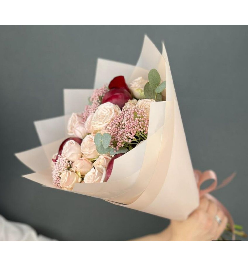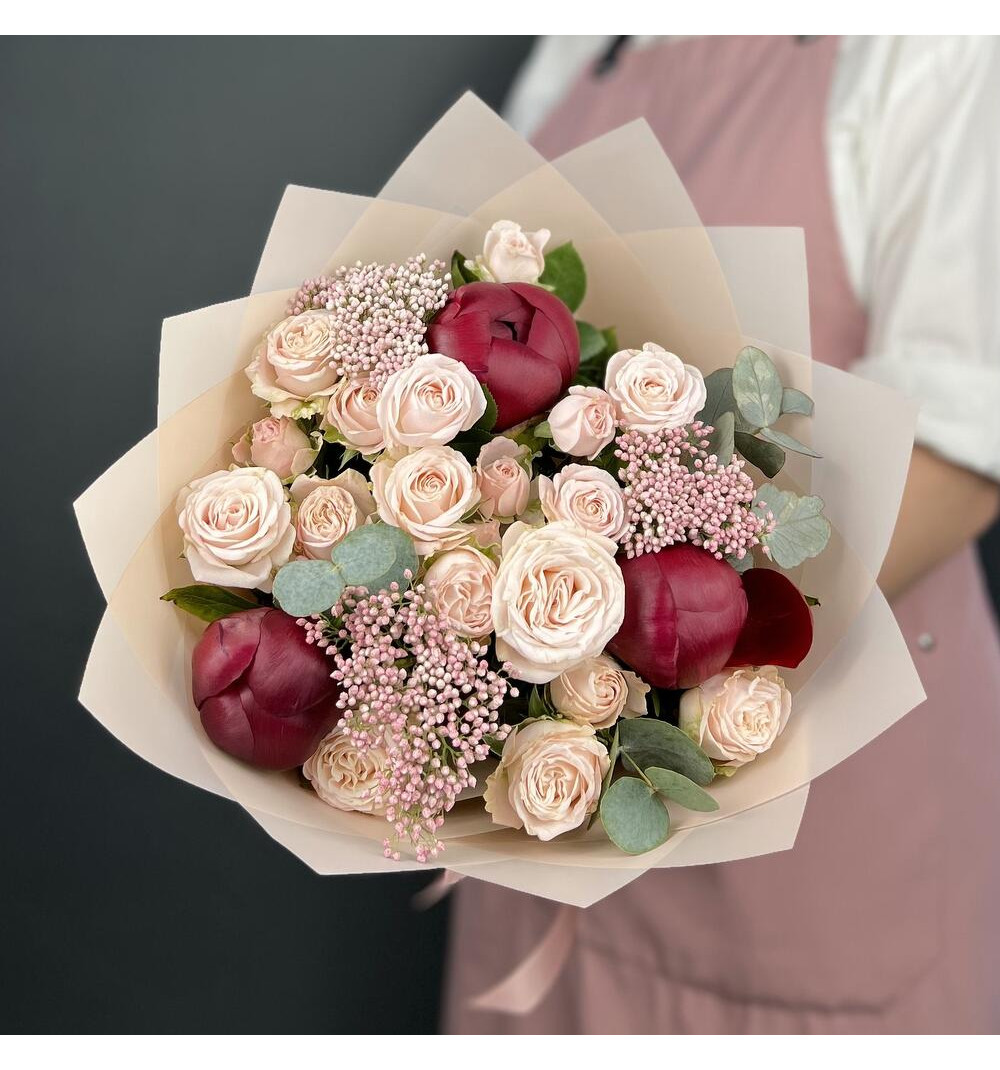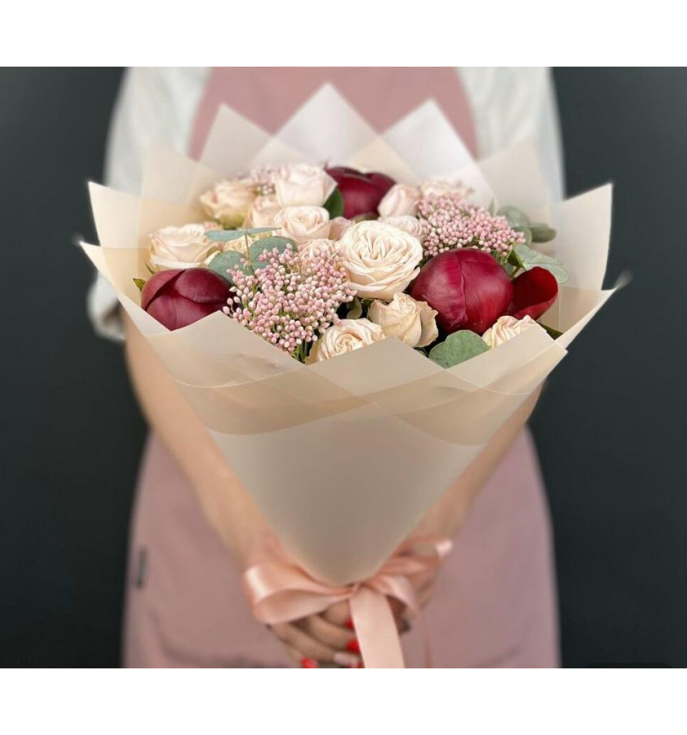 Купить Авторский букет из красных Пионов и кремовых кустовых Роз с Озотамнусом в Аксае за 20 000 ₸ | интернет-магазин «Guls»