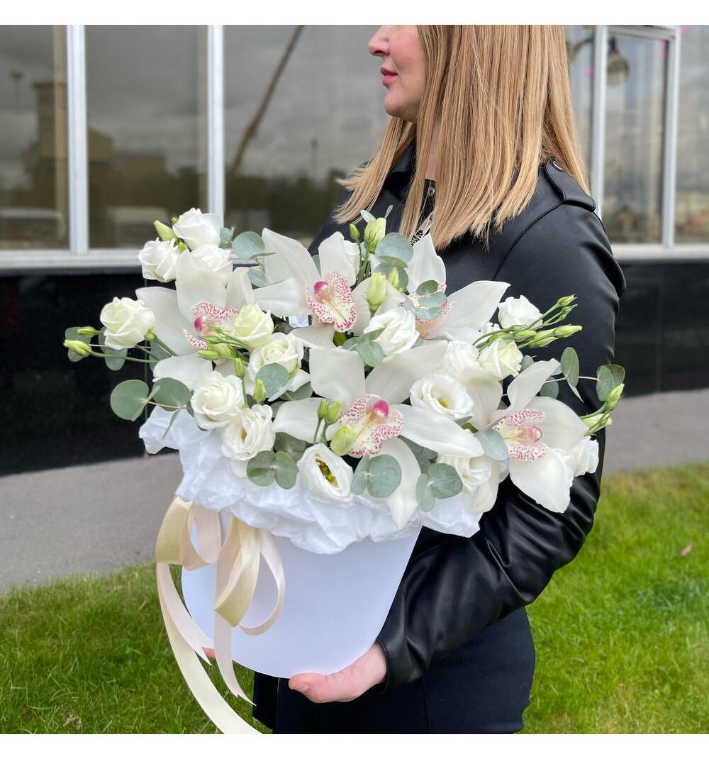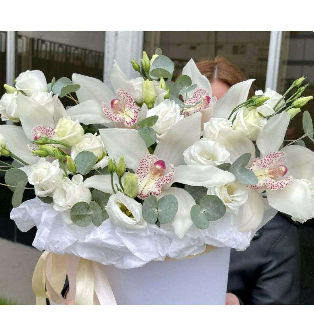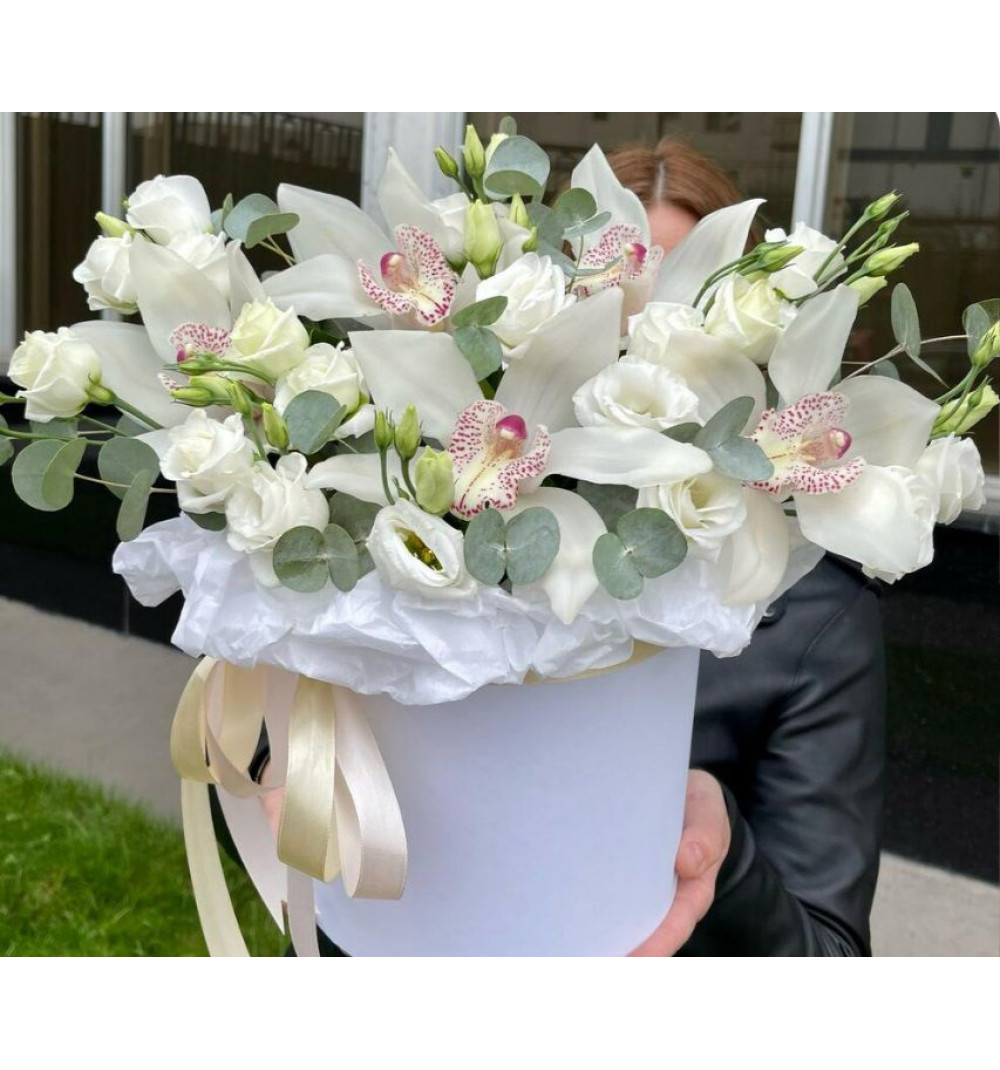 Купить Орхидея белая с эустомой в коробочке в Аксае за 25 000 ₸ | интернет-магазин «Guls»
